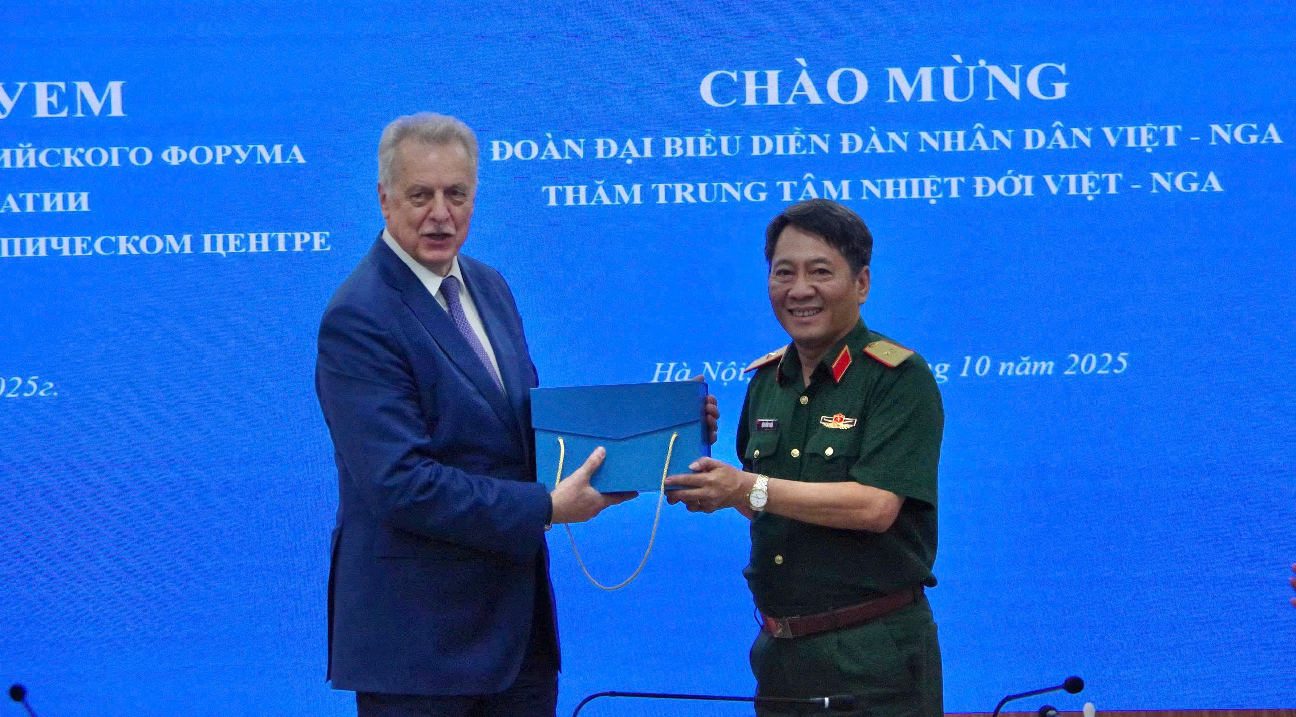 Cũng tại buổi tiếp, Tiến sỹ Khoa học Andray Nikolaievich Kuznetsov - Tổng Giám đốc phía Nga Trung tâm Nhiệt đới Việt - Nga, đã báo cáo tóm tắt quá trình hình thành, phát triển và những thành tựu nổi bật của Trung tâm tới đoàn đại biểu. Theo đó, Trung tâm Nhiệt đới Việt - Nga được thành lập ngày 07/3/1988, có Cơ sở chính tại Hà Nội; Chi nhánh Ven biển tại Nha Trang, tỉnh Khánh Hòa; Chi nhánh Phía Nam và Trung tâm Chuyển giao Công nghệ mới tại Thành phố Hồ Chí Minh. Các hướng nghiên cứu chính của Trung tâm bao gồm: sinh thái nhiệt đới, y học, khoa học vật liệu và công nghệ sinh học, cũng như giảng dạy tiếng Nga cho đối tượng học viên là các sĩ quan quân đội và đào tạo cán bộ khoa học trình độ cao.