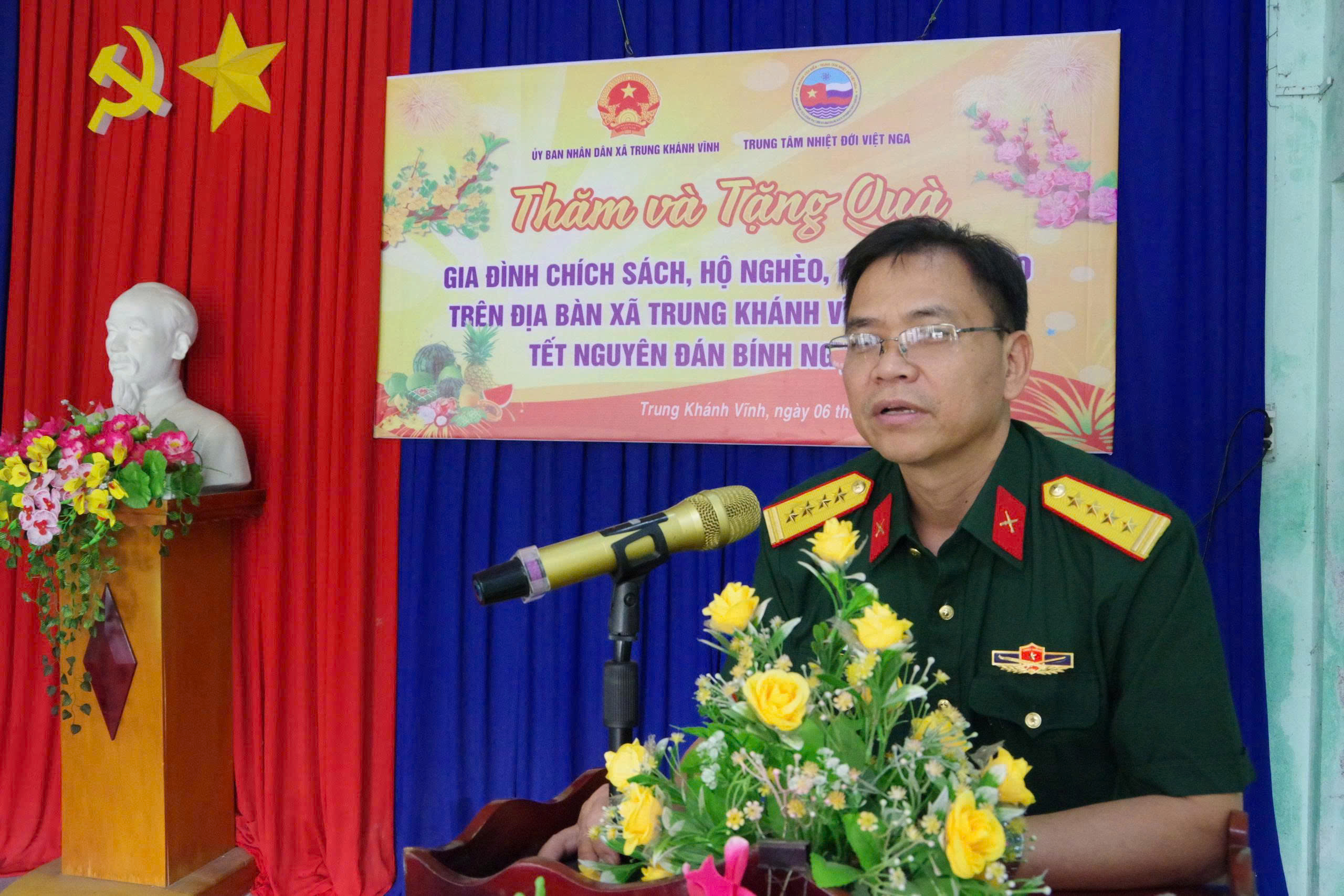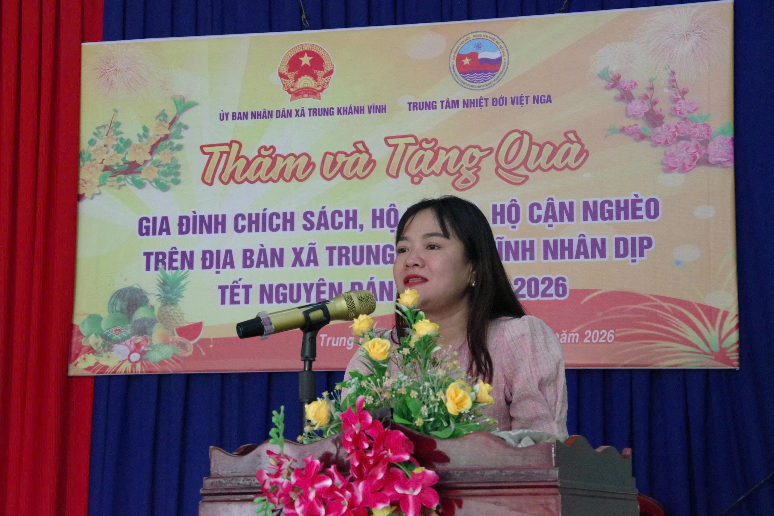 Phát biểu cảm ơn tại chương trình, bà Cao Thị Ngọc Thanh - Chủ tịch UBND xã Trung Khánh Vĩnh bày tỏ sự trân trọng đối với tình cảm, sự quan tâm và những đóng góp thiết thực của cán bộ, nhân viên, chiến sĩ Chi nhánh Ven biển, Trung tâm Nhiệt đới Việt - Nga đối với địa phương; đồng thời khẳng định đây là nguồn động viên to lớn, giúp người dân vùng cao thêm niềm tin, nghị lực vươn lên trong cuộc sống.