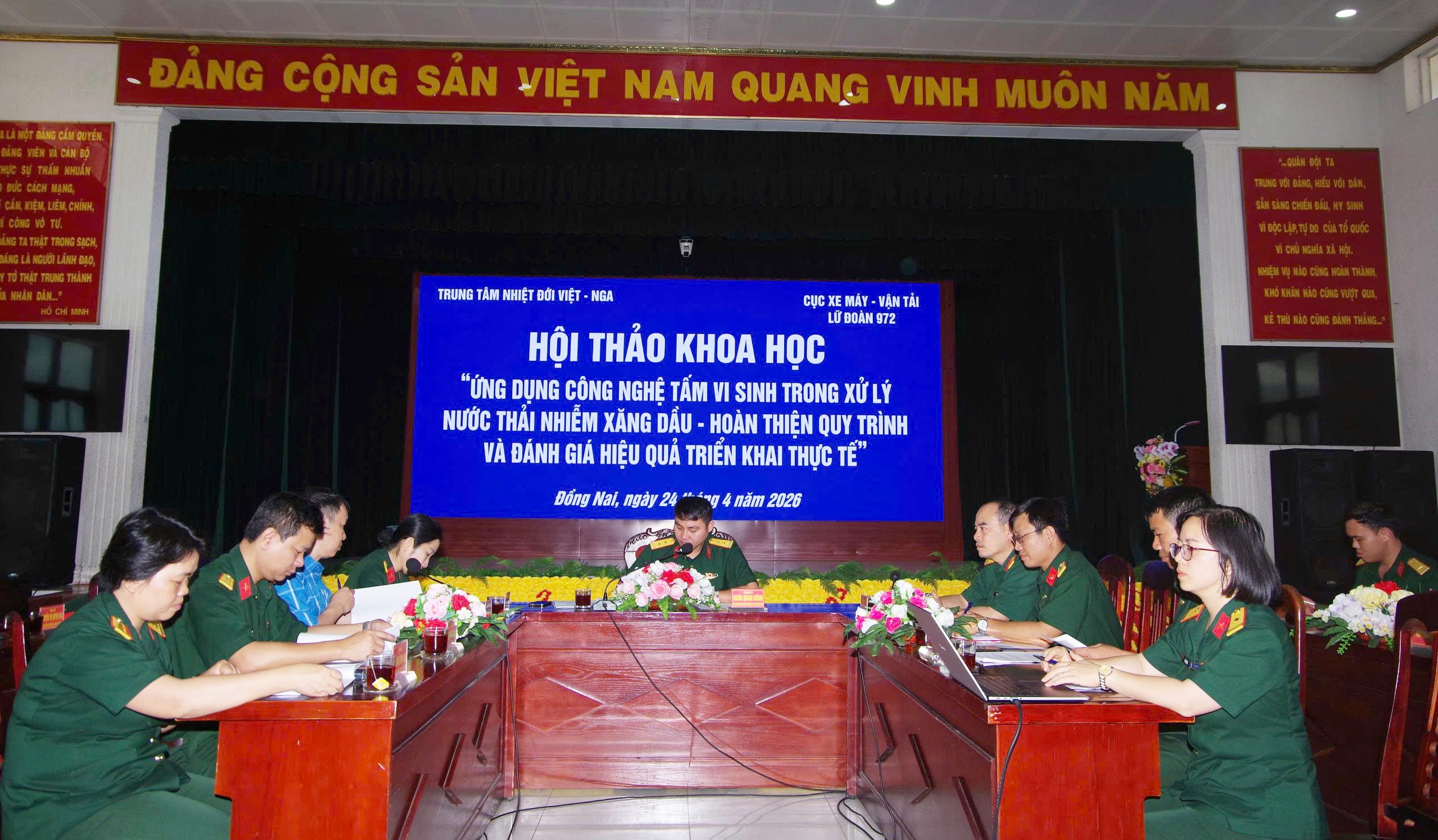 29/04/2026Trong các ngày 21 và 24/4, Trung tâm Nhiệt đới Việt - Nga (Trung tâm) đã tổ chức Hội đồng nghiệm thu kỹ thuật kết hợp Hội thảo khoa học với chủ đề: “Ứng dụng công nghệ sử dụng tấm vi sinh trong xử lý nước thải nhiễm xăng dầu – Hoàn thiện quy trình và đánh giá hiệu quả triển khai thực tế” tại Trường Cao đẳng Kỹ thuật Quân sự 1 và Lữ đoàn 972/Cục Xe máy - Vận tải.