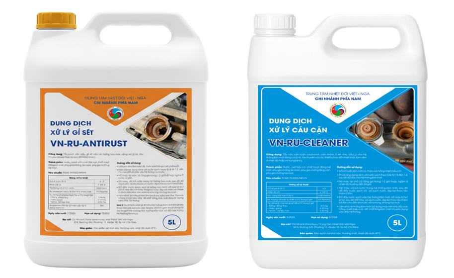 Sản phẩm dung dịch xử lý cáu cặn VN-RU-CLEANER và chất lỏng xử lý gỉ sét VN-RU-ANTIRUST.
