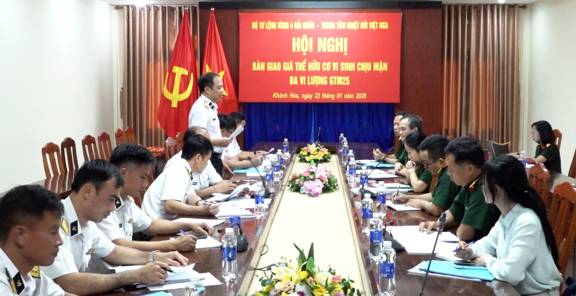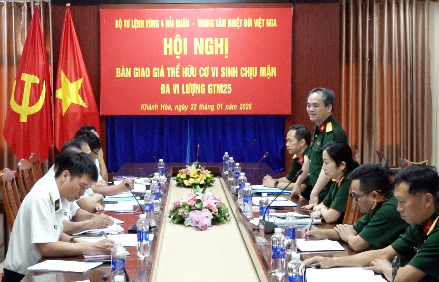 22/01/2026Chiều 22/01, tại Bộ Tư lệnh Vùng 4 Hải quân, Trung tâm Nhiệt đới Việt - Nga (Trung tâm) tổ chức Hội nghị bàn giao 45 tấn giá thể hữu cơ vi sinh chịu mặn đa vi lượng GTM25 cho Bộ Tư lệnh Vùng 4 và Bộ Tư lệnh Vùng 2 Hải quân, phục vụ thử nghiệm cải tạo cát san hô thành đất trồng rau xanh, cây xanh tại một số đơn vị đóng quân trên các đảo.