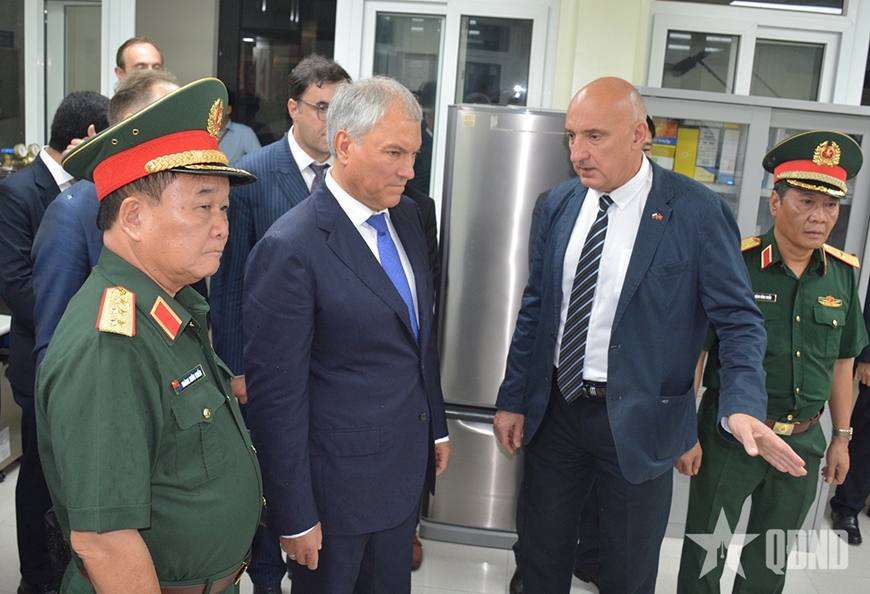Chủ tịch Duma Quốc gia Quốc hội Liên bang Nga Vyacheslav Volodin và Thượng tướng Hoàng Xuân Chiến tham quan phòng thí nghiệm tại Trung tâm Nhiệt đới Việt-Nga.
