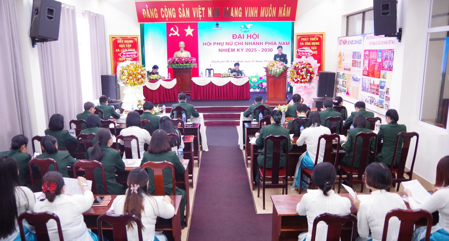 03/10/2025Sáng ngày 03/10, Hội Phụ nữ Chi nhánh Phía Nam (Chi nhánh) tổ chức Đại hội nhiệm kỳ 2025 - 2030. Dự và chỉ đạo Đại hội có đồng chí Thượng tá Hà Văn Toàn, Bí thư Đảng ủy, Chính trị viên; đồng chí Đại tá Nguyễn Văn Thịnh, Phó Bí thư Đảng ủy, Giám đốc Chi nhánh; dự theo dõi Đại hội có các đồng chí lãnh đạo, chỉ huy các cơ quan, đơn vị trực thuộc, Ban chấp hành Chi đoàn thanh niên.