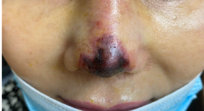 Mảng hoại tử đen khô vùng chóp mũi sau phẫu thuật.