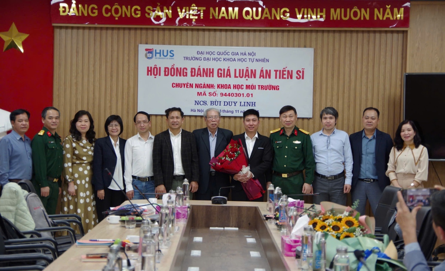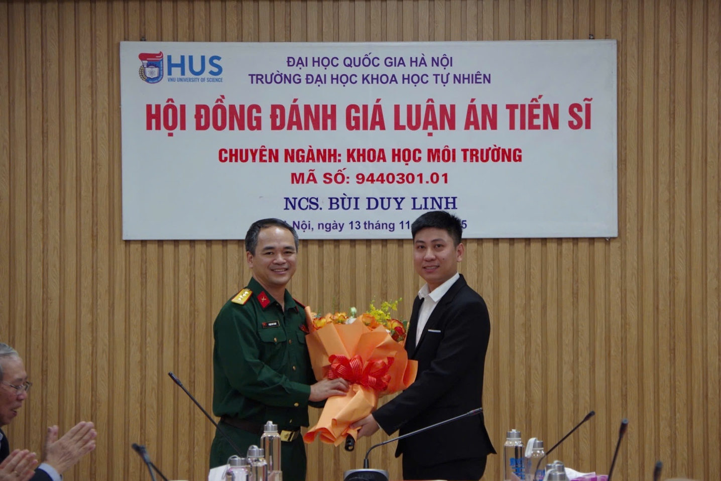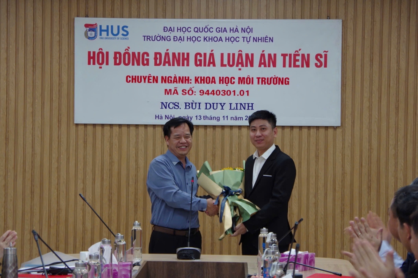 TS Trần Thiện Cường, Phó trưởng khoa Khoa Môi trường, Trường Đại học Khoa học Tự nhiên, Đại học Quốc gia Hà Nội chúc mừng NCS. Bùi Duy Linh bảo vệ thành công luận án Tiến sĩ.