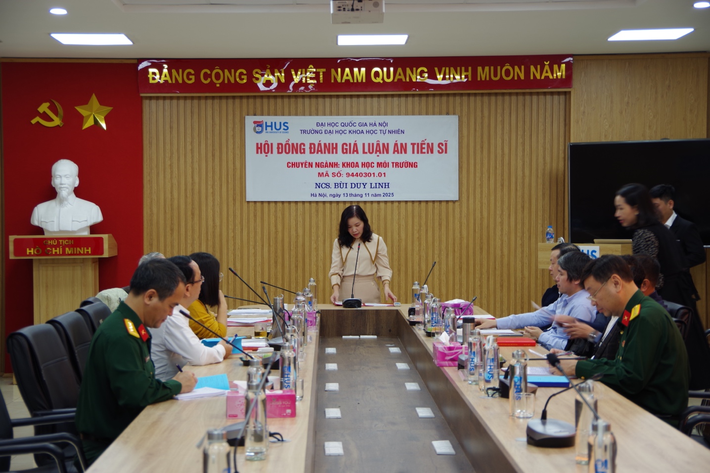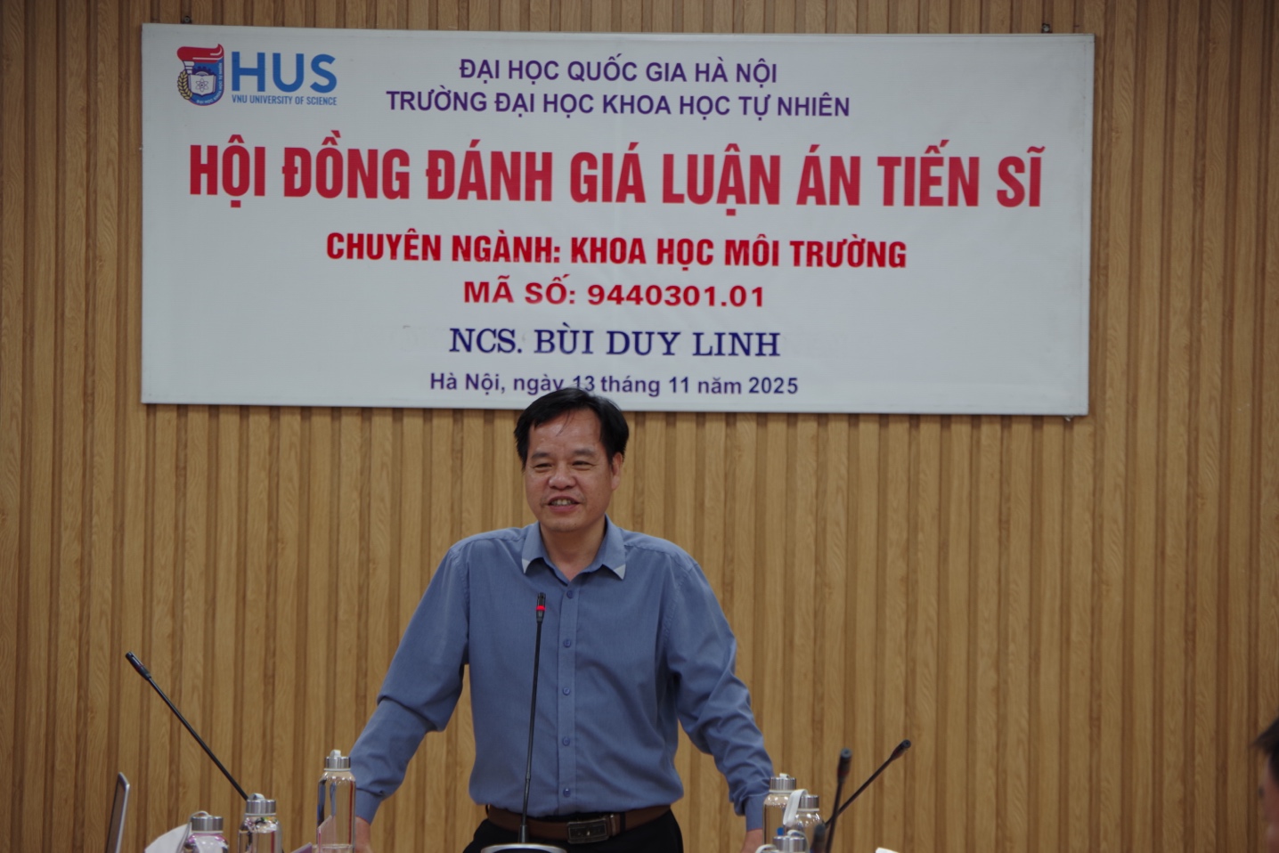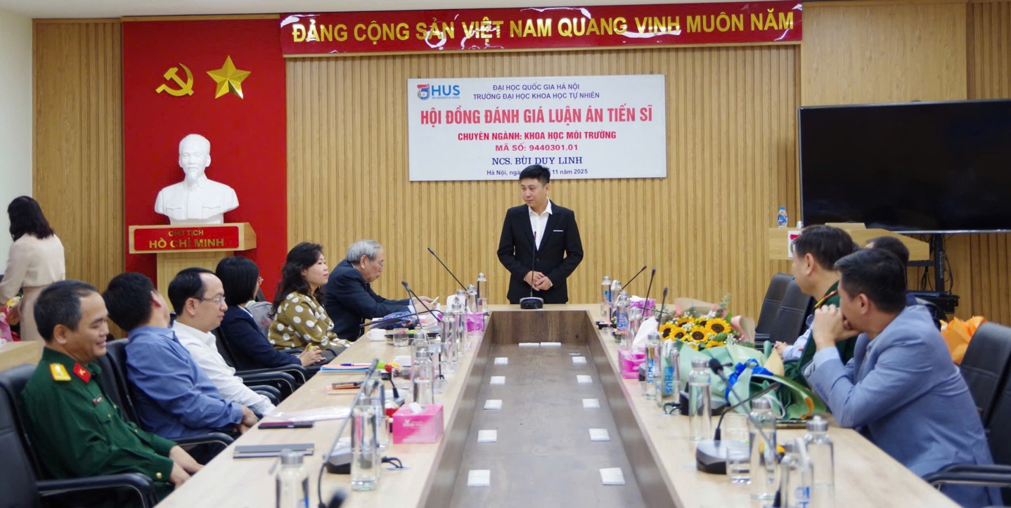14/11/2025Sáng ngày 13/11, tại Trường Đại học Khoa học Tự nhiên/Đại học Quốc gia Hà Nội, diễn ra buổi họp Hội đồng đánh giá luận án tiến sĩ cấp Đại học Quốc gia cho nghiên cứu sinh (NCS) Bùi Duy Linh, nghiên cứu viên thuộc Phân viện Hoá - Môi trường/Trung tâm Nhiệt đới Việt - Nga với đề tài “Nghiên cứu diễn biến và đặc điểm của bụi mịn trong môi trường không khí tại khu vực Biên Hòa - Tỉnh Đồng Nai”. Đề tài thuộc chuyên ngành Khoa học Môi trường, mã số 9440301.01, được thực hiện dưới sự hướng dẫn của PGS. TS. Hoàng Anh Lê và TS. Nghiêm Xuân Trường.