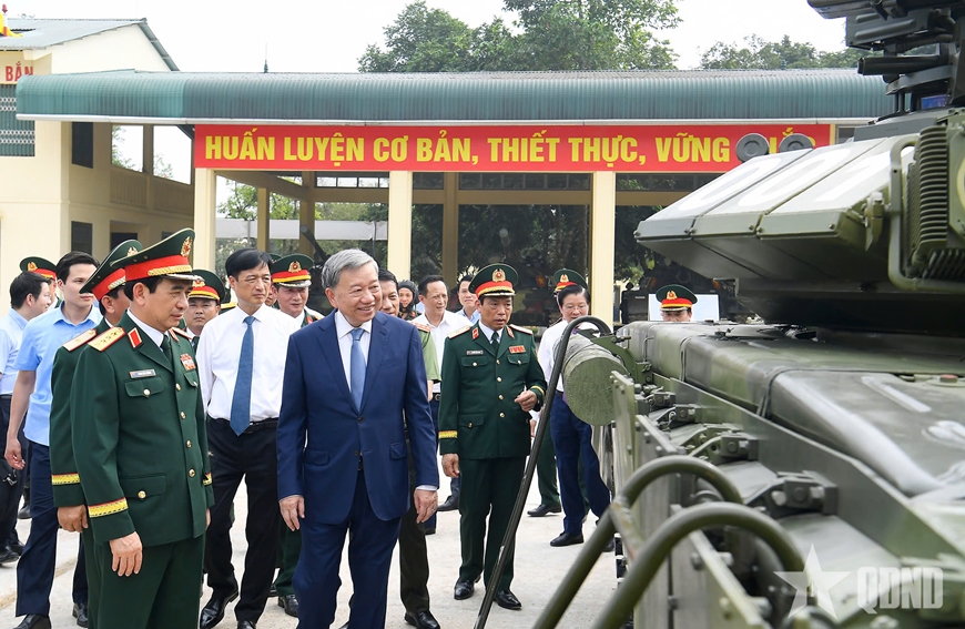 Tổng Bí thư Tô Lâm, Bí thư Quân ủy Trung ương và Đại tướng Phan Văn Giang, Ủy viên Bộ Chính trị, Phó bí thư Quân ủy Trung ương, Bộ trưởng Bộ Quốc phòng cùng các đại biểu tham quan khí tài tại Lữ đoàn Xe tăng 201, Binh chủng Tăng thiết giáp. Ảnh: Tuấn Huy.