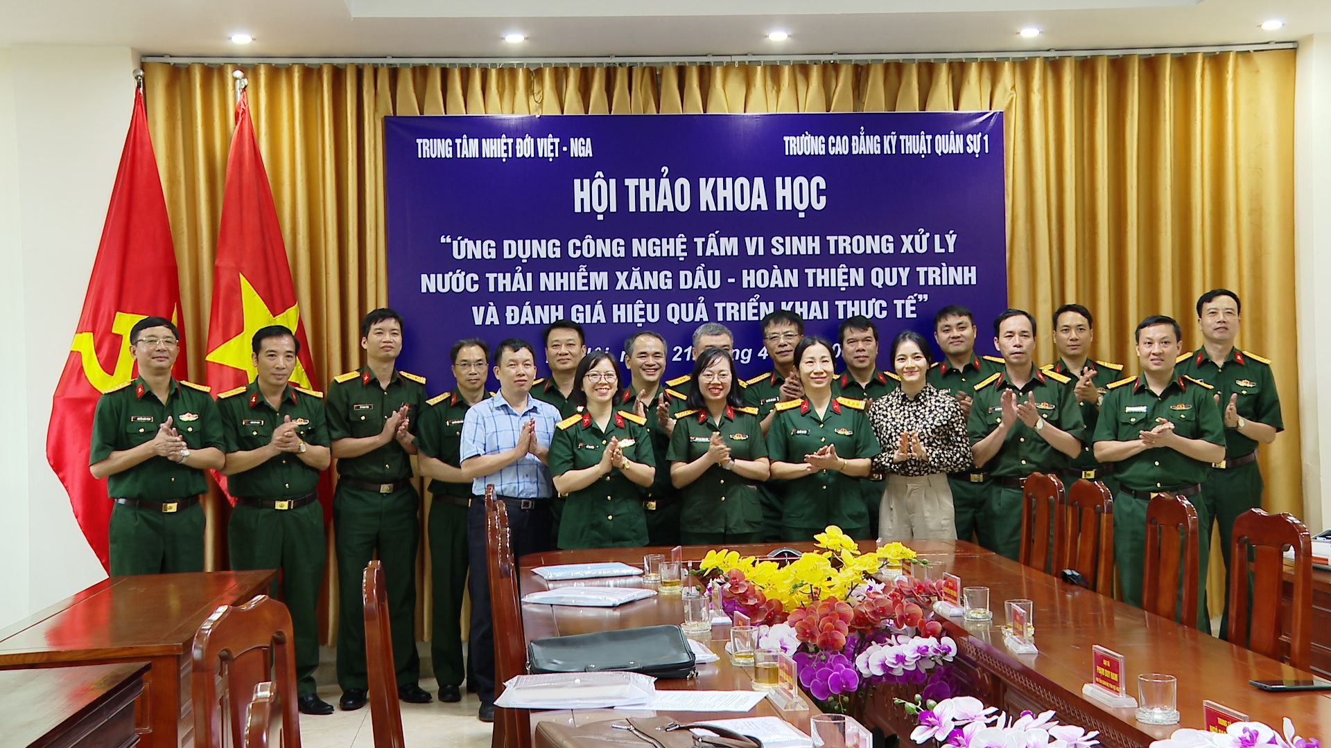 29/04/2026Trong các ngày 21 và 24/4, Trung tâm Nhiệt đới Việt - Nga (Trung tâm) đã tổ chức Hội đồng nghiệm thu kỹ thuật kết hợp Hội thảo khoa học với chủ đề: “Ứng dụng công nghệ sử dụng tấm vi sinh trong xử lý nước thải nhiễm xăng dầu – Hoàn thiện quy trình và đánh giá hiệu quả triển khai thực tế” tại Trường Cao đẳng Kỹ thuật Quân sự 1 và Lữ đoàn 972/Cục Xe máy - Vận tải.
