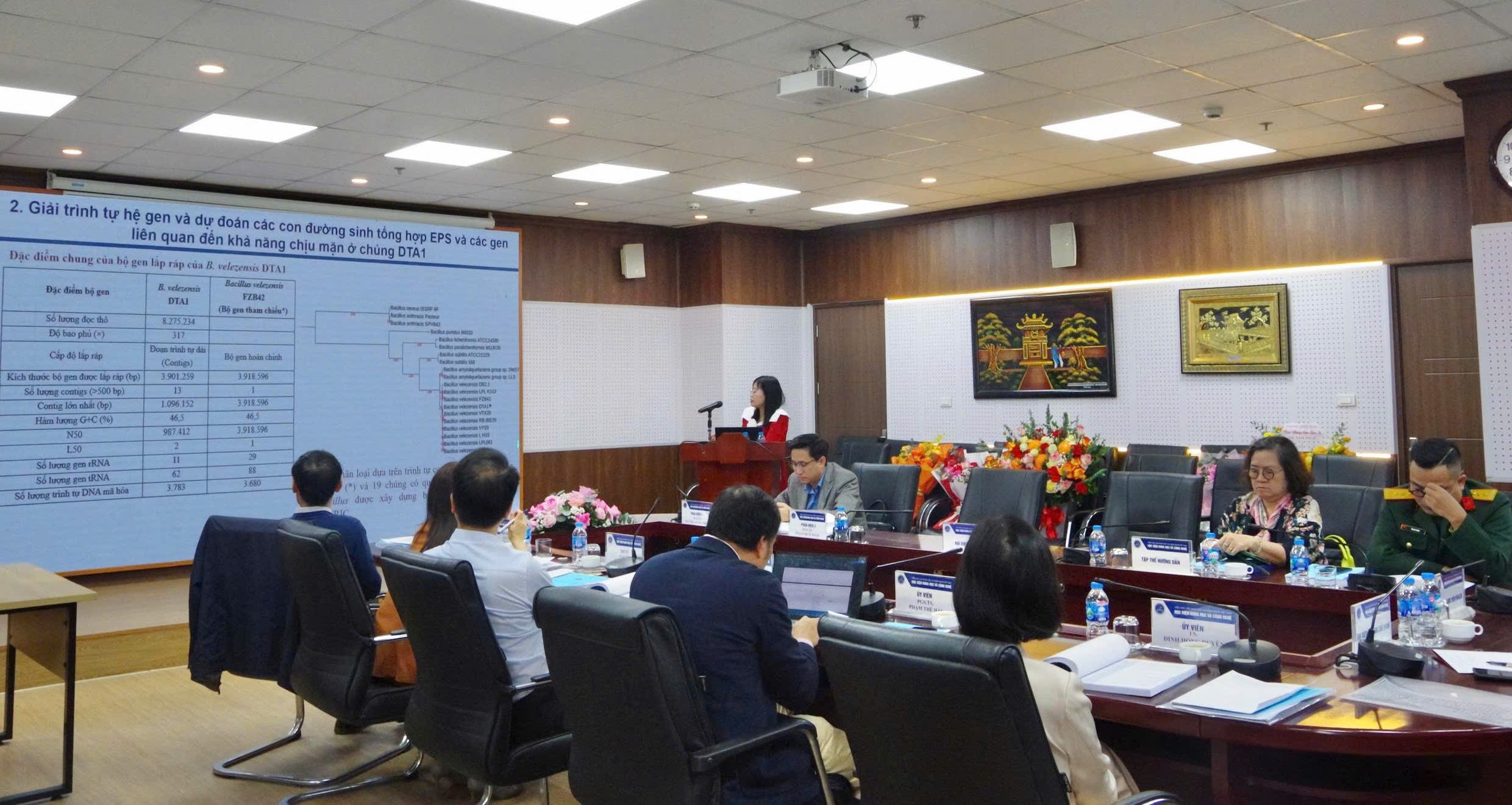 Tiếp đó, NCS Lê Thị Huệ đã trình bày báo cáo tóm tắt luận án trước Hội đồng, trong đó làm rõ cơ sở khoa học, mục tiêu, nội dung và phương pháp nghiên cứu. Báo cáo đồng thời nhấn mạnh những kết quả chính và các đóng góp mới của luận án trong việc nghiên cứu, ứng dụng vi khuẩn chịu mặn sinh EPS nhằm nâng cao khả năng giữ ẩm và giảm mặn cho cát san hô tại khu vực Trường Sa. Theo đó, nghiên cứu đã: